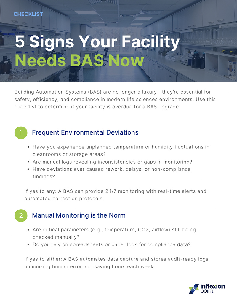 Building Automation Systems (BAS) are no longer a luxury—they’re essential for safety, efficiency, and compliance in modern life sciences environments. Use this checklist to determine if your facility is overdue for a BAS upgrade.