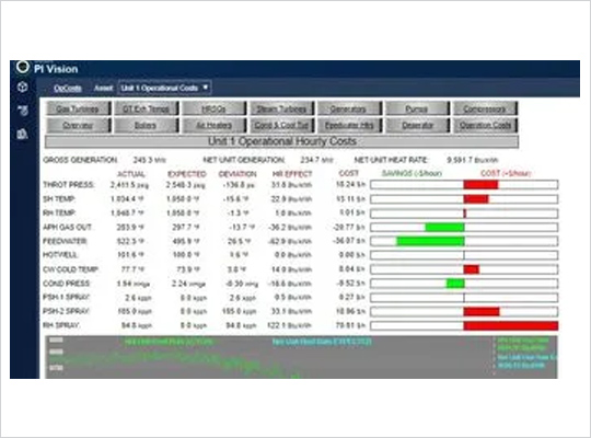 This PI System plugin module calculates real time financial losses or savings (in $/hour) based upon given operational parameters in comparison to the target values. It is extremely valuable in identifying opportunities for immediate savings. Operational parameters are compared to expected values and corresponding effects on unit heat rate (or efficiency) and corresponding fuel costs/savings are calculated real-time and displayed. Parameters include Main Steam Pressure and Temperature, Reheat Temperature, Condenser Pressure, Cooling Tower Outlet Temperature (when Cooling Tower Performance is included), Feedwater Temperature, Hotwell Temperature, Attemperation Spray Flows, and Auxiliary Station Service Power. Operators can customize the manufacturer’s design curves upon installation and can easily adjust them anytime afterward.