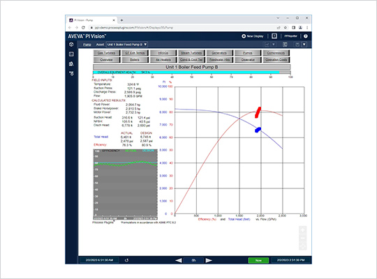 This PI System plugin produces very useful graphics for early identification of boiler feed pump problems and performance degradation. The plugin features a PI Vision display and a daily operations report automatically delivered to your email inbox. Easily review calculations in your PI Asset Framework data – no hidden black box mysteries. The module’s real time calculations include driver/pump set efficiency, pump efficiency, performance factor, suction head, NPSH, discharge head, and total head. Pump head and efficiency are calculated and plotted against the expected curves respectively. Reference curves are scalable, dynamic, and adjust with pump speed as appropriate.