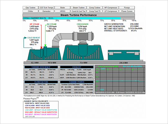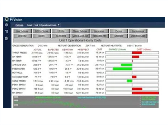 This PI System plugin module calculates real time financial losses or savings (in $/hour) based upon given operational parameters in comparison to the target values. It is extremely valuable in identifying opportunities for immediate savings. Operational parameters are compared to expected values and corresponding effects on unit heat rate (or efficiency) and corresponding fuel costs/savings are calculated real-time and displayed. Parameters include Main Steam Pressure and Temperature, Reheat Temperature, Condenser Pressure, Cooling Tower Outlet Temperature (when Cooling Tower Performance is included), Feedwater Temperature, Hotwell Temperature, Attemperation Spray Flows, and Auxiliary Station Service Power. Operators can customize the manufacturer’s design curves upon installation and can easily adjust them anytime afterward.