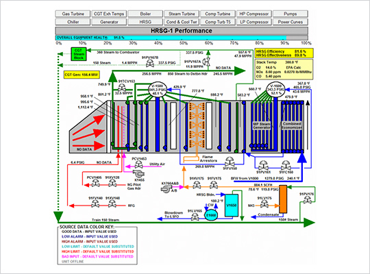 This PI System plugin is useful for identifying Heat Recovery Steam Generator (HRSG) integrity issues due to corrosion or other problems. It tracks and displays real-time HRSG efficiency and effectiveness metrics (HP and LP as applicable). NIST-JANAF tables are used to formulate flue gas enthalpies which are used to perform the necessary gas-side energy balances.