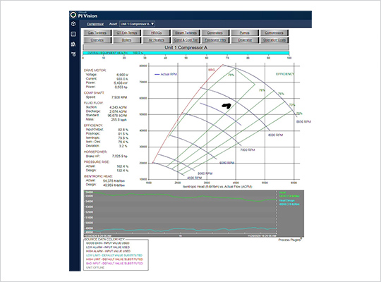 This PI System plugin makes it easy to add advanced monitoring and alerting for reciprocating compressors to your PI Vision displays. Calculate easy-to-read overall health score metrics. Compare current asset performance with manufacturer specific methodologies, tables, and curves. Replace irksome number tables with clearly plotted charts and graphs for monitoring displays. Identify and alert on unsafe operating patterns. Provide early warnings for slow trend variances from optimal norms. Maximize asset utilization, extends asset life, and avoids downtime.